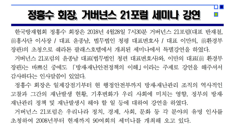 거버넌스21 포럼 특강 2018-04-27 목록보기 이전글제25회 방재의 날 기념행사 개최 안내2018.05.17 다음글2018 재난사진 공모전 및 재난예방 포스터 공모 결과 발표2018.04.12