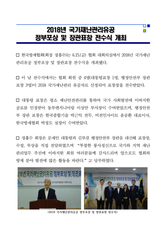 2018년 국가재난관리유공 정부포상 및 장관표창 전수식 개최 2018-06-15 목록보기 이전글2018년 제1회 방재기술평가 운영위원회 개최2018.07.02 다음글김부겸 행정안전부 장관 방재의 날 기념식 참석2018.05.29