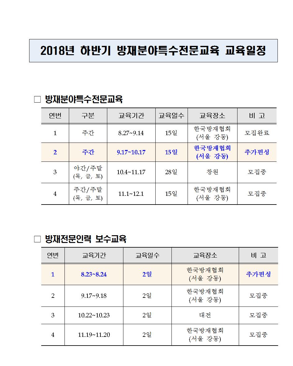 2018년 하반기 방재분야특수전문교육 추가개설 안내