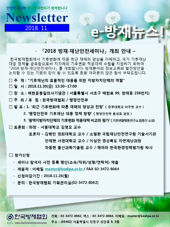 2018 방재·재난안전세미나 개최 안내 2018-11-20 2018 방재·재난안전세미나 개최계획.hwp (1264130K) 목록보기 이전글제4회 대한민국 안전산업박람회 개최 및 개막식 참석2018.11.16 다음글2018년 제6회 방재분야 특수전문교육 수료2018.10.23