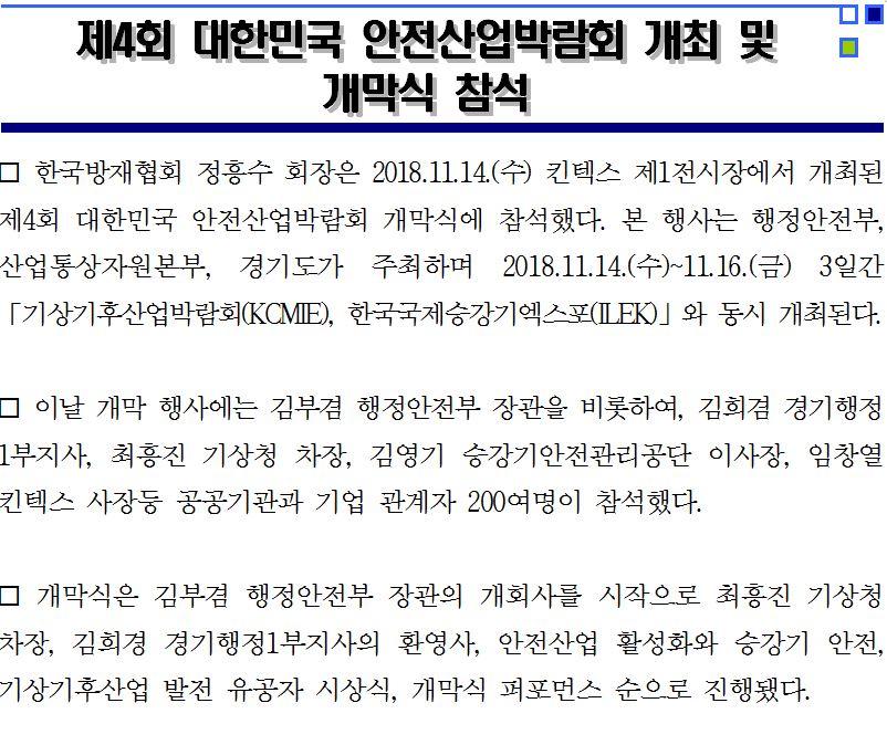 제4회 대한민국 안전산업박람회 개최 및 개막식 참석 2018-11-16 목록보기 이전글한국방재협회 제77차 이사회 개최2018.11.22 다음글2018 방재·재난안전세미나 개최 안내2018.11.20