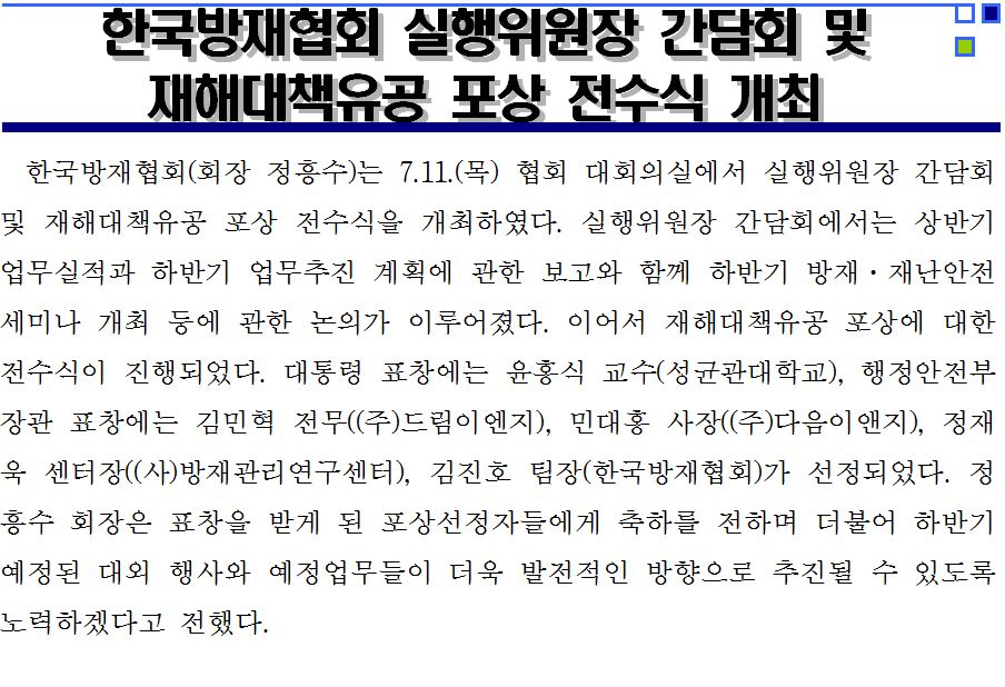 한국방재협회 실행위원장 간담회 및 재해대책유공 포상 전수식 개최 2019-07-12 목록보기 이전글한국방재협회장, 행정안전부 안전신고 협업 민간대표자 간담회 참석2019.07.24 다음글한국방재협회, 제26회 방재의 날 기념식 개최2019.05.28