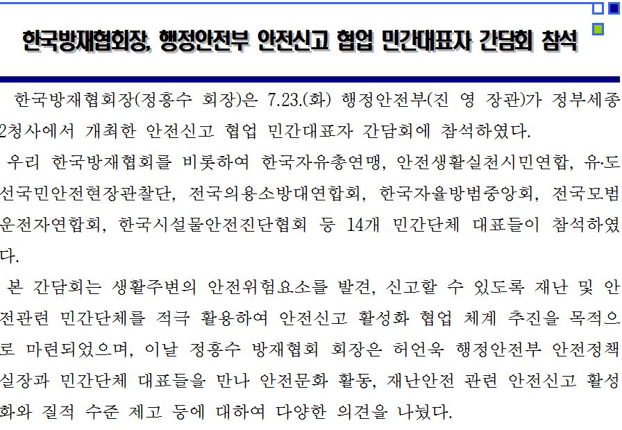 한국방재협회장, 행정안전부 안전신고 협업 민간대표자 간담회 참석 2019-07-24 목록보기 이전글급경사지 재해예방을 위한 전문가 토론회 개최2019.11.26 다음글한국방재협회 실행위원장 간담회 및 재해대책유공 포상 전수식 개최2019.07.12