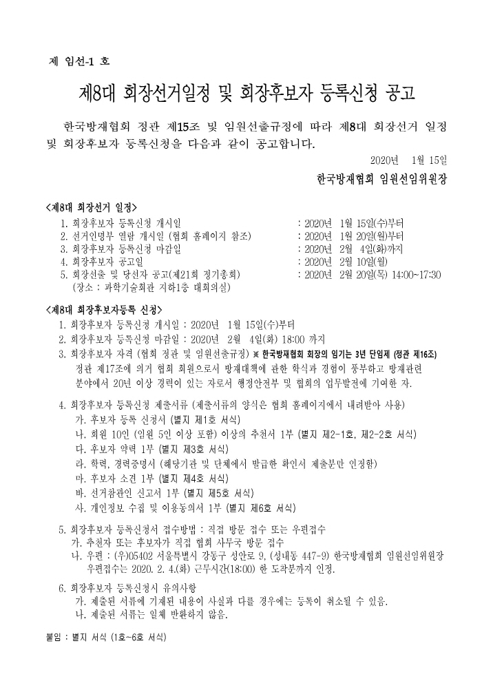 제8대 회장선거 일정 및 회장후보자 등록신청 2020-01-14 [붙임]별지서식(1호~6호 서식).hwp (42496K) 목록보기 이전글제8대 회장 임원선임위원자격 대상자 명부 열람기간 및 장소 공고2020.01.20 다음글급경사지 재해예방을 위한 전문가 토론회 개최2019.11.26