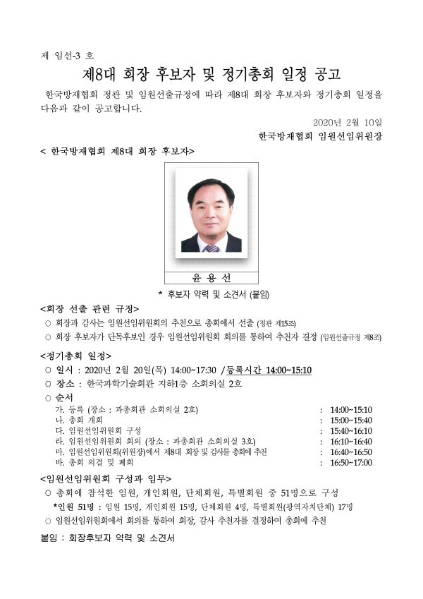 제8대 회장후보자 및 선거일정 공고 2020-02-10 공고3 제8대 회장후보자 및 선거일정 공고.hwp (367104K) (단체,특별) 임원선임위원 위임장.hwp (94208K) 목록보기 이전글제8대 윤용선 회장 선출2020.02.21 다음글제8대 회장 임원선임위원자격 대상자 명부 열람기간 및 장소 공고2020.01.20
