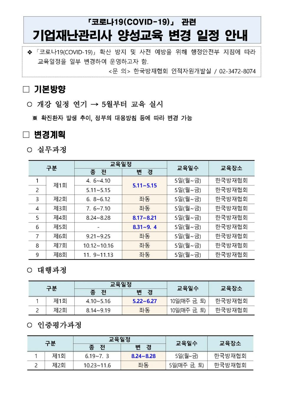 코로나19 관련 교육일정 변경 안내(기업재난관리사 양성교육) 2020-03-27 목록보기 이전글한국방재협회 선출직 대의원 모집 공고2020.04.02 다음글한국방재협회 회장 이·취임식 개최2020.03.02