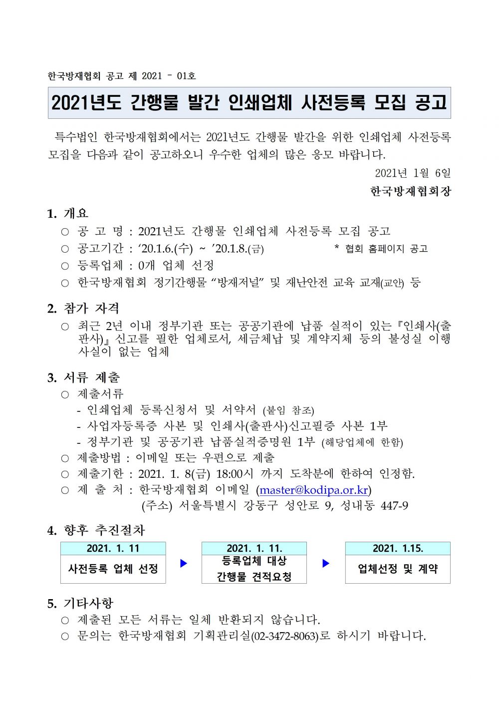 2021년 간행물 발간 인쇄업체 사전등록 모집 공고 2021-01-06 [붙임]신청서및서약서.hwp (34816K) 목록보기 이전글2021년 방재분야 특수전문교육 신규강사 모집2021.01.14 다음글방재관리대책대행자 등록 등의 업무 위탁기관 지정 공고2020.12.24