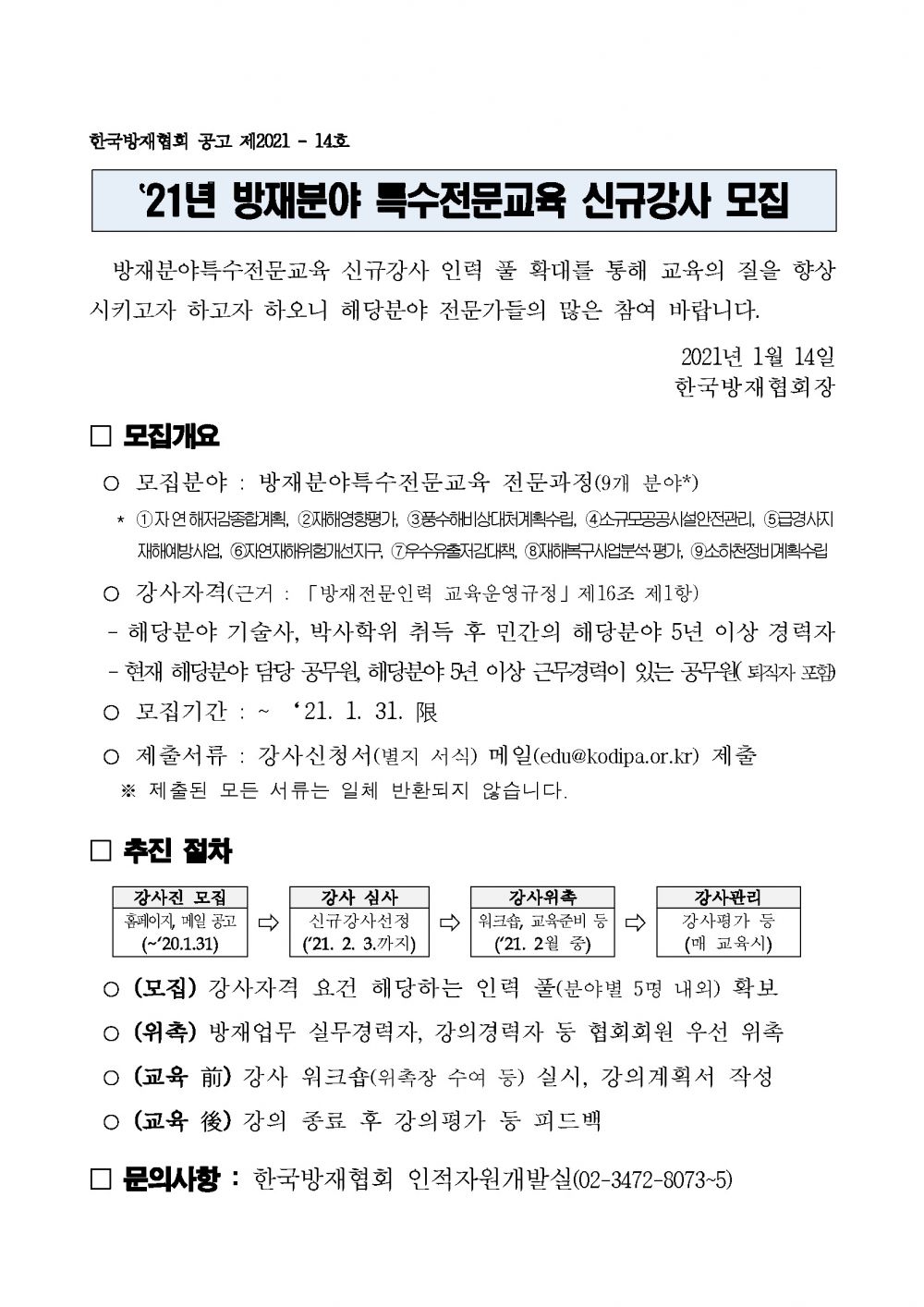 2021년 방재분야 특수전문교육 신규강사 모집 2021-01-14 [별지]방재분야 특수전문교육 강사신청서.hwp (68608K) 목록보기 이전글강원도 제안서 평가위원 후보자 모집 안내2021.01.28 다음글2021년 간행물 발간 인쇄업체 사전등록 모집 공고2021.01.06