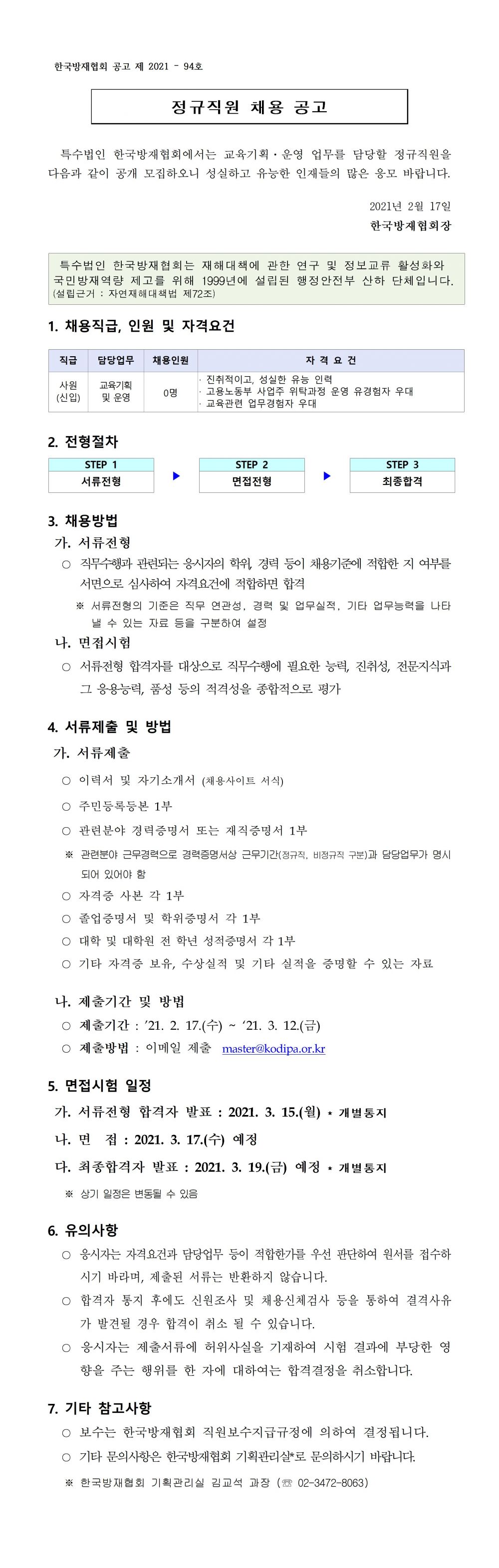 한국방재협회 정규직원 채용 공고(교육운영) 2021-03-03 목록보기 이전글취임 1주년 윤용선 회장 "재난으로부터 안전한 사회를"2021.03.05 다음글2021년 정기총회(제22회) 및 이사회(제86차) 개최2021.02.26