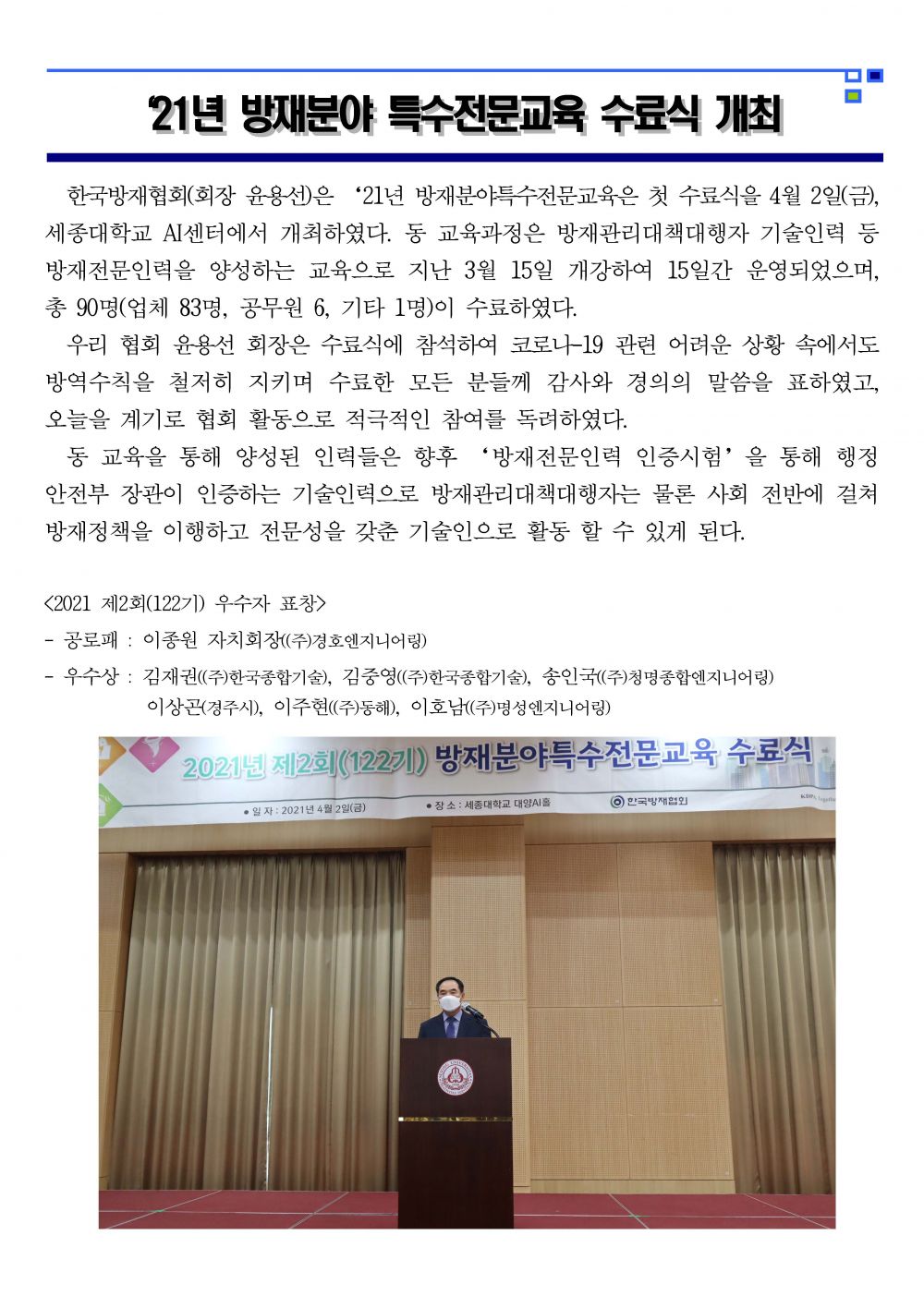 ‘21년 방재분야 특수전문교육 수료식 개최 2021-04-02 목록보기 이전글한국방재협회 윤용선 회장, 「어린이 교통안전 릴레이 챌린지」참여2021.05.04 다음글한국방재협회 지방공기업평가원과 업무협약 체결2021.03.24