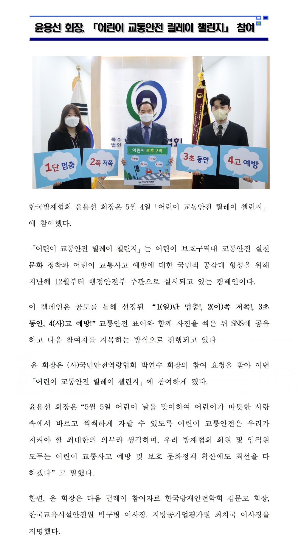 한국방재협회 윤용선 회장, 「어린이 교통안전 릴레이 챌린지」참여 2021-05-04 목록보기 이전글제28회 방재의 날 기념 세미나 개최2021.05.24 다음글‘21년 방재분야 특수전문교육 수료식 개최2021.04.02