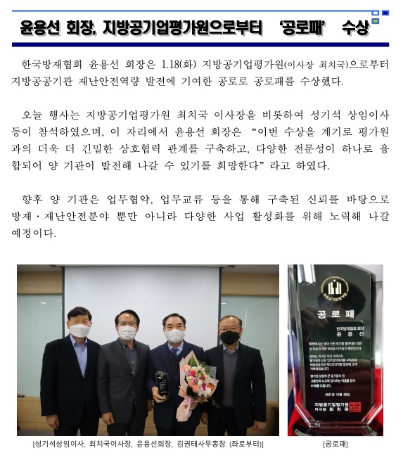 윤용선 회장, 지방공기업평가원으로부터 ‘공로패’ 수상 2022-01-18 목록보기 이전글한국방재협회 제23회 정기총회 개최2022.02.23 다음글한국방재협회, 제주특별자치도개발공사와 업무협약 체결2021.12.30