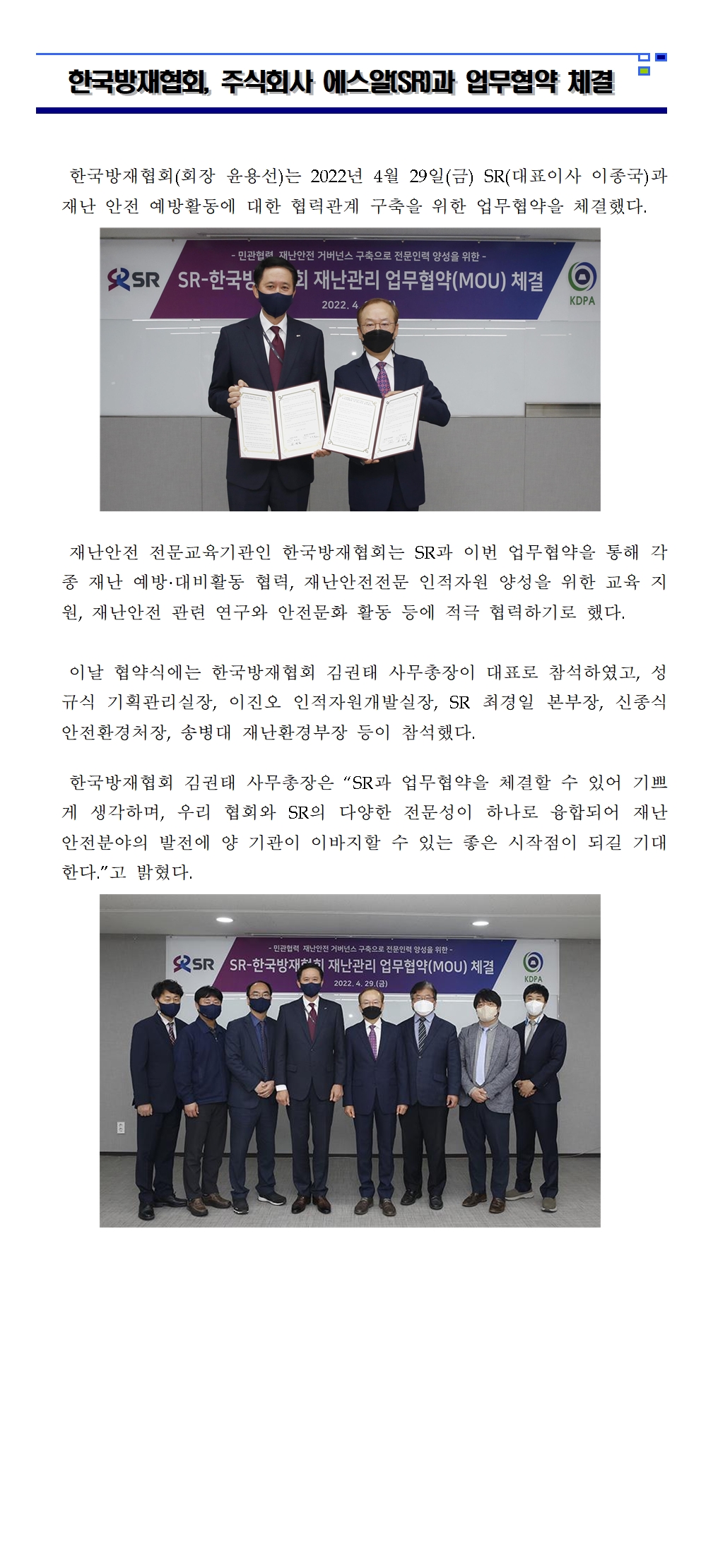 한국방재협회, 주식회사 에스알(SR)과 업무협약 체결 2022-05-03 목록보기 이전글제29회 방재의 날 기념행사2022.05.18 다음글한국방재협회 제23회 정기총회 개최2022.02.23
