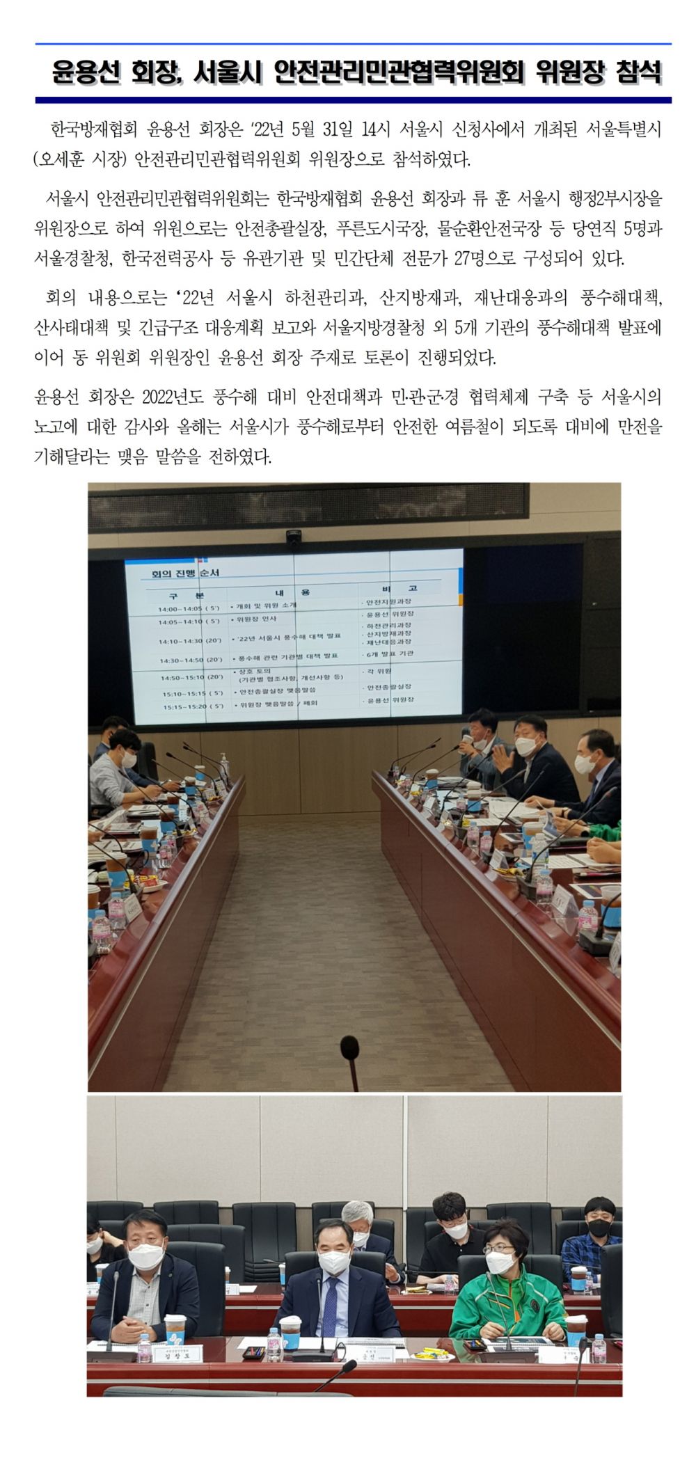 윤용선 회장, 서울시 안전관리민관협력위원회 위원장 참석 2022-05-31 목록보기 이전글한국방재협회 여름철 안전 라디오 캠페인2022.07.05 다음글제29회 방재의 날 기념행사 개최2022.05.27