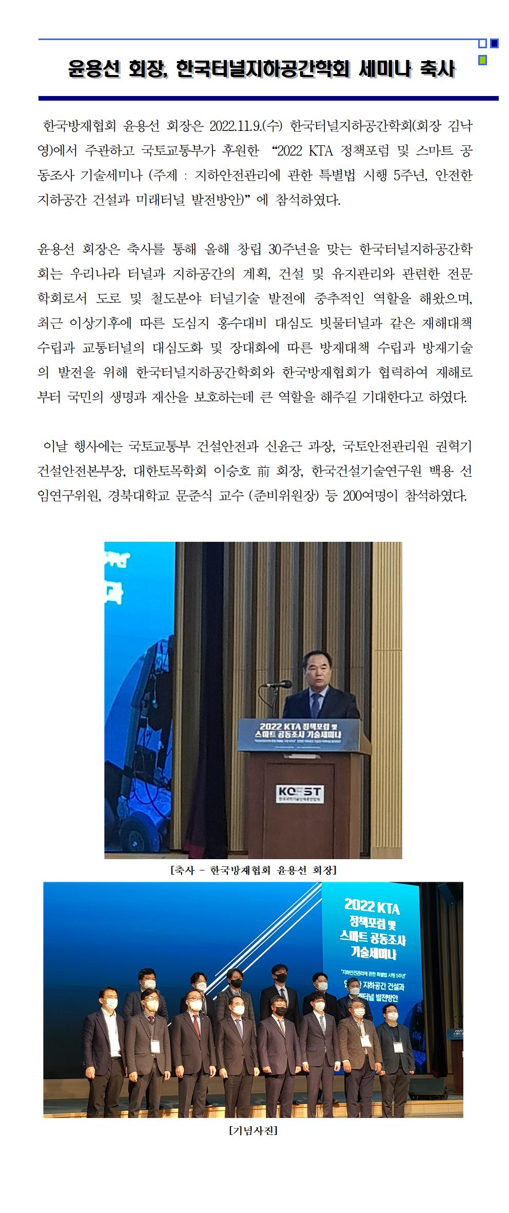 윤용선 회장, 한국터널지하공간학회 세미나 축사 2022-11-09 목록보기 이전글윤용선 회장, 한국일보 기고문('22.11.29) 「이상기후와 겨울철 재난관리」2022.11.29 다음글이태원 참사에 대한 애도2022.10.31