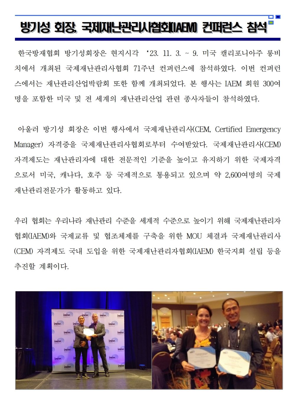 방기성회장, 국제재난관리사협회 컨퍼런스 참석 2023-11-10 목록보기 이전글한국방재협회, 「경상북도 봉화군」 찾아가는 생애주기별 국민안전 맞춤교육 실시”2023.11.28 다음글“한국방재협회, 「경기도 오산시」 자율방재단 찾아가는 맞춤 생애주기별 국민안전교육 실시”2023.11.10