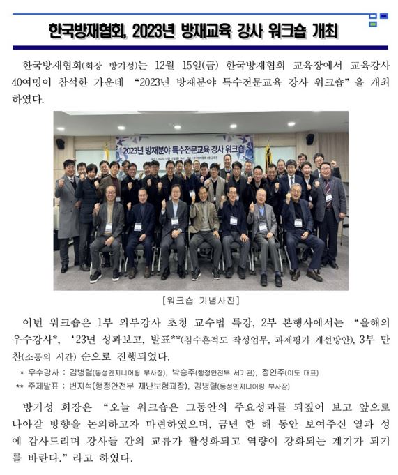 한국방재협회, 2023년 방재교육 강사 워크숍 개최 2023-12-18 목록보기 이전글한국방재협회 안재현 부회장, 제6기 중앙안전관리민관협력위원 위촉2024.01.24 다음글“한국방재협회, 「경상북도 김천시」 맞춤형 재난안전종사자 전문교육 실시”2023.11.29