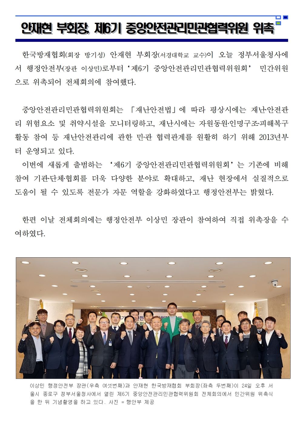 한국방재협회 안재현 부회장, 제6기 중앙안전관리민관협력위원 위촉 2024-01-24 목록보기 이전글R&D 및 정책제안 아이디어 수요조사2024.02.15 다음글한국방재협회, 2023년 방재교육 강사 워크숍 개최2023.12.18
