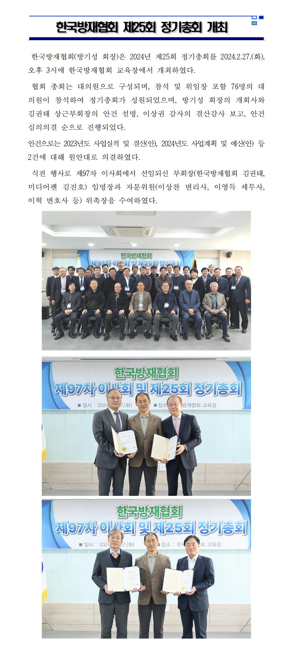 한국방재협회 제25회 정기총회 개최 2024-02-28 목록보기 이전글공인재난관리사 자격제도 기반 마련을 위한 「재난 및 안전관리 기본법」 개정안 국회 통과2024.03.04 다음글R&D 및 정책제안 아이디어 수요조사2024.02.15