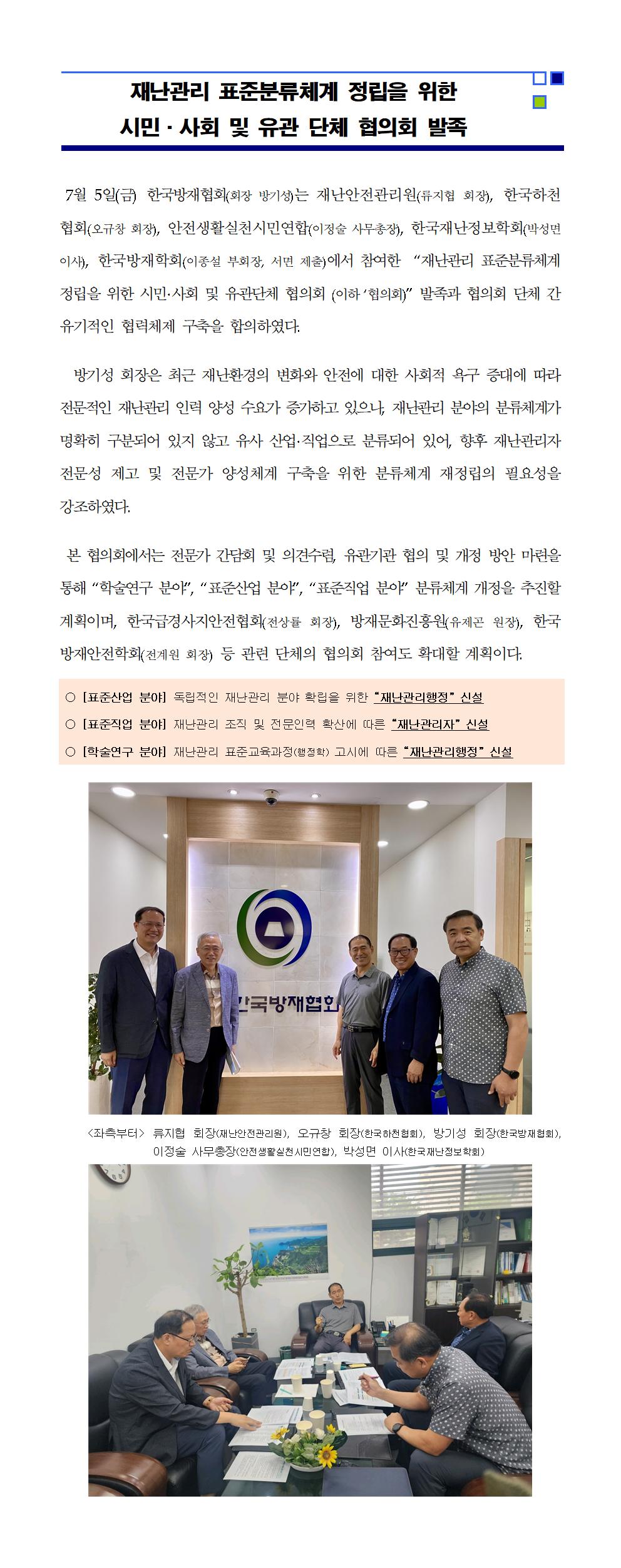 재난관리 표준분류체계 정립을 위한 시민·사회 및 유관 단체 협의회 발족 2024-07-05 목록보기 이전글한국엔지니어링협회와 방재(재난안전) 엔지니어링분야 MOU 체결2024.07.23 다음글재난관리(지진방재분야) 전문인력 양성 교육기관 선정 공모 관련 협조 요청2024.06.10