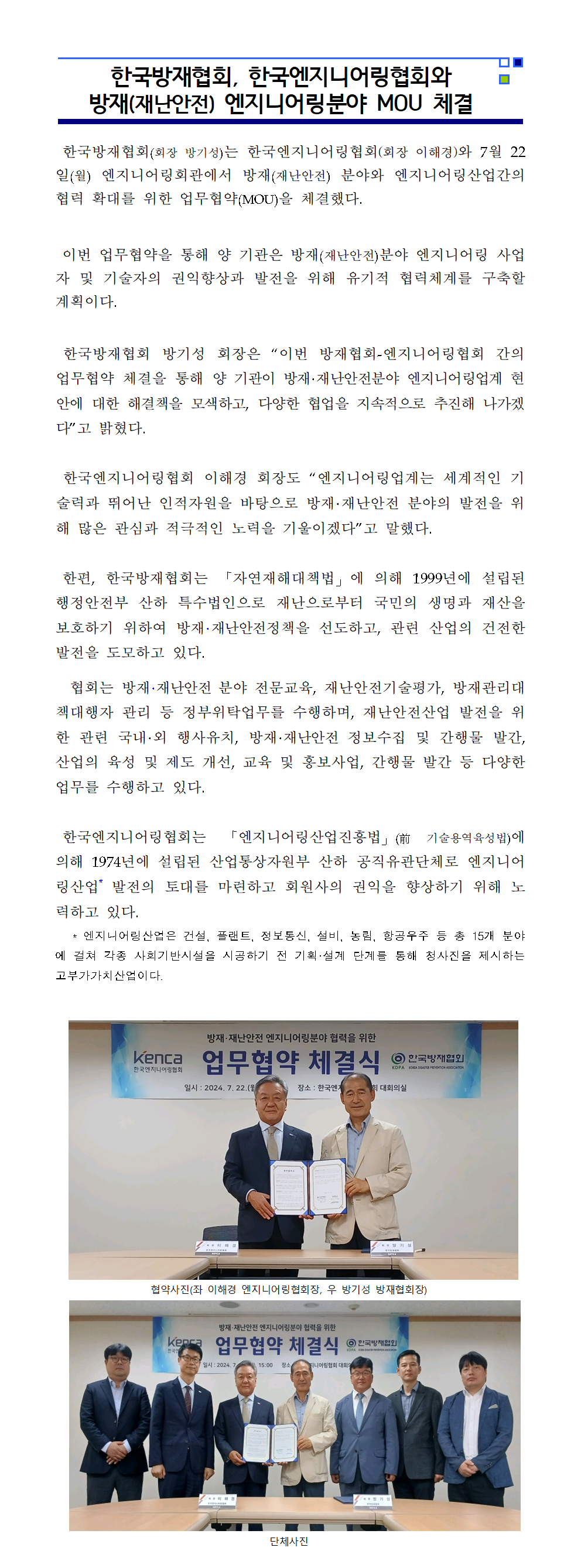 한국엔지니어링협회와 방재(재난안전) 엔지니어링분야 MOU 체결 2024-07-23 목록보기 이전글국립재난안전연구원과 재난안전분야 연구 및 정책선진화를 위한 업무협약 체결2024.09.06 다음글재난관리 표준분류체계 정립을 위한 시민·사회 및 유관 단체 협의회 발족2024.07.05