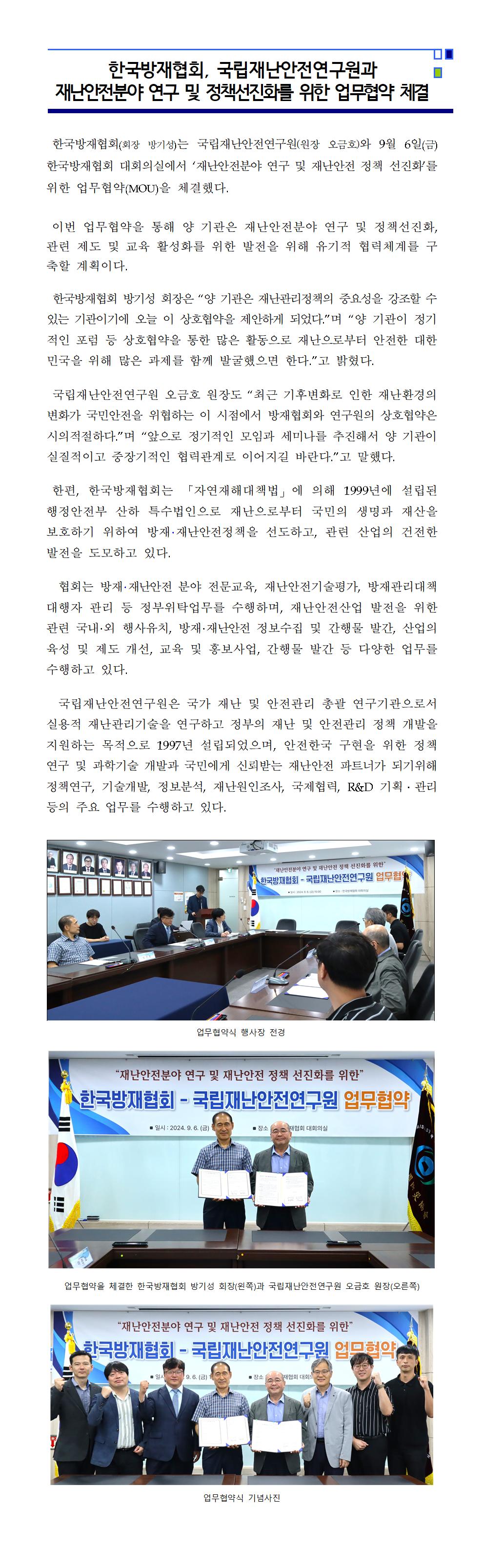 국립재난안전연구원과 재난안전분야 연구 및 정책선진화를 위한 업무협약 체결 2024-09-06 목록보기 이전글2024년 재난사진 공모전 기간 연장 안내(~11/1)2024.09.10 다음글한국엔지니어링협회와 방재(재난안전) 엔지니어링분야 MOU 체결2024.07.23