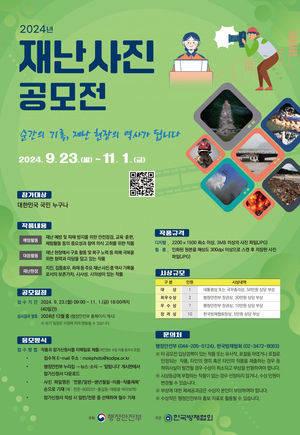 2024년 재난사진 공모전 기간 연장 안내(~11/1) 2024-09-10 2024년 재난사진 공모전 안내문(연장).hwpx (80703K) 2024년 재난사진 공모전 참가 신청서.hwpx (56605K) 목록보기 이전글2024년 재난예방 포스터 공모전 기간 연장 안내(~11/1)2024.09.10 다음글국립재난안전연구원과 재난안전분야 연구 및 정책선진화를 위한 업무협약 체결2024.09.06