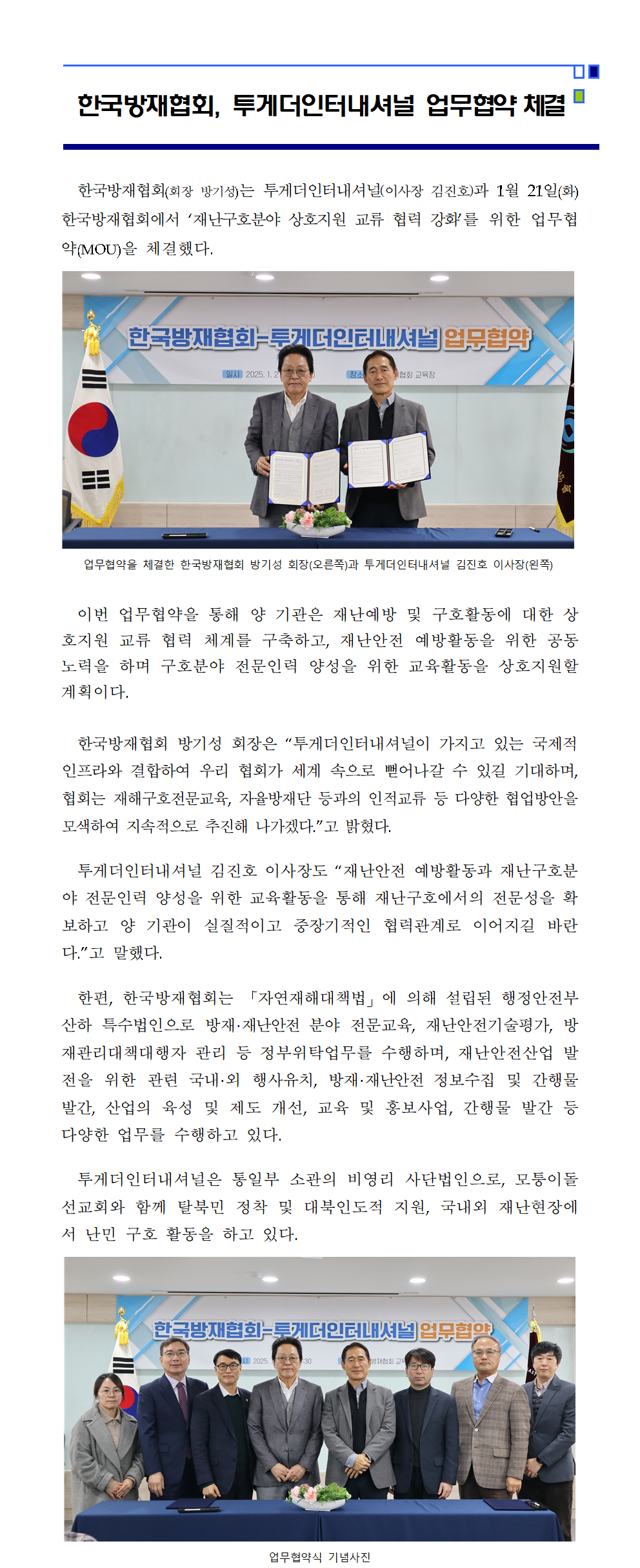 투게더인터내셔널과 재해구호분야 MOU 체결 2025-01-21 목록보기 이전글한국방재협회, 동아대 긴급대응기술정책연구센터 업무협약 체결2025.02.21 다음글한국방재협회, 제1회 재난관리정책 리더스 포럼 개최2024.12.02