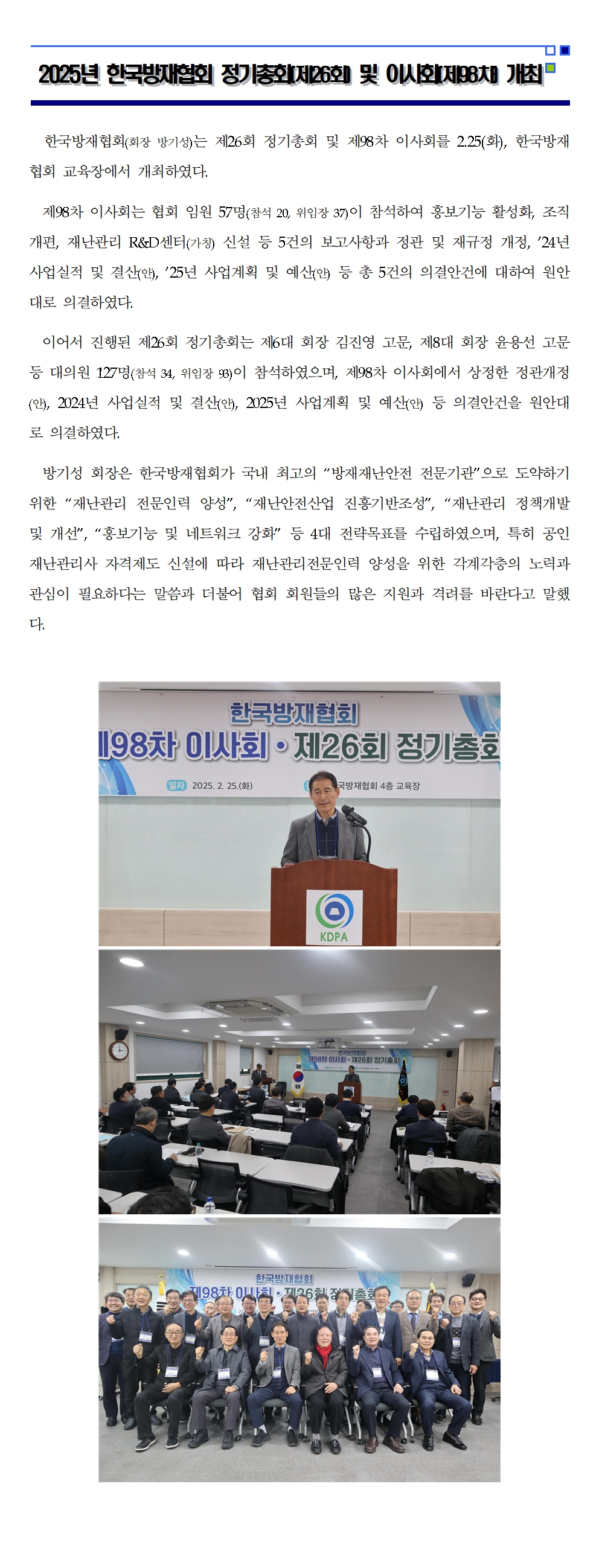 한국방재협회 제26회 정기총회 및 제98차 이사회 개최 2025-02-26 목록보기 이전글[언론보도] 양산시, 재난안전분야 종사자교육 실시2025.04.14 다음글한국방재협회, 제2회 재난관리정책 리더스 포럼 개최2025.02.21