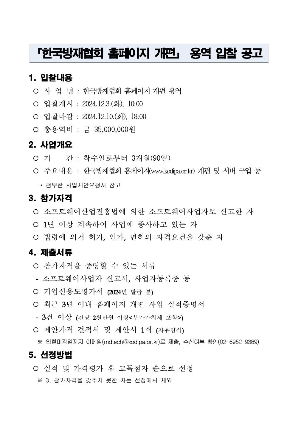 [공고] 한국방재협회 홈페이지 개편 용역 입찰 공고 2024-12-03 [공고] 한국방재협회 홈페이지 개편 용역 입찰 공고.pdf (61951K) [첨부] 제안요청서 및 유사분야 개발실적 양식.hwp (69632K) 목록보기 이전글재난관리책임기관의 역량강화를 위한 방재관리 컨설팅 신청 안내2025.04.07 다음글방재관리대책대행자 민원업무시스템 이용안내2021.03.30