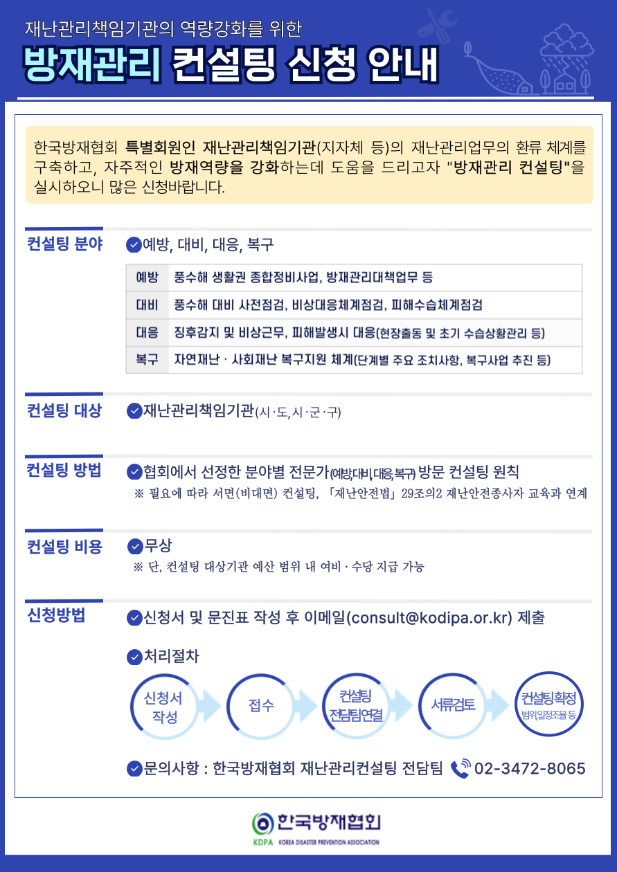 재난관리책임기관의 역량강화를 위한 방재관리 컨설팅 신청 안내 2025-04-07 2-1. 방재관리 컨설팅 신청 안내.png (295135K) 2-2. 방재관리 컨설팅 신청서 및 문진표.hwp (167424K) 목록보기 이전글재난관리책임기관의 핵심기능 유지를 위한 “기능연속성계획 컨설팅” 신청 안내2025.04.16 다음글[공고] 한국방재협회 홈페이지 개편 용역 입찰 공고2024.12.03