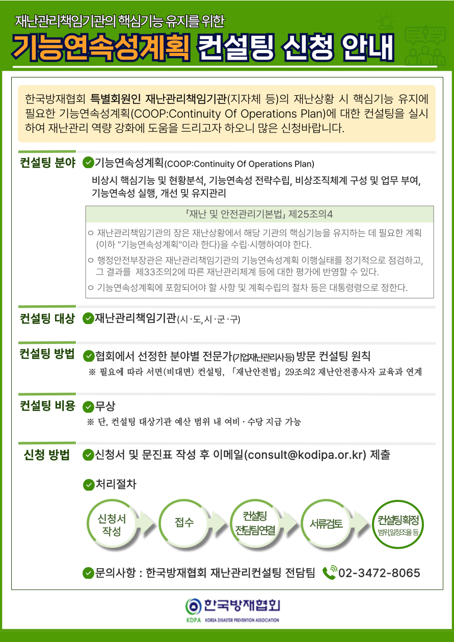 재난관리책임기관의 핵심기능 유지를 위한 “기능연속성계획 컨설팅” 신청 안내 2025-04-16 1. 기능연속성계획 컨설팅 신청 안내.png (322410K) 능연속성계획 신청서 및 문진표.hwp (86528K) 목록보기 이전글재난관리 역량강화를 위한 “중대시민재해 컨설팅” 신청 안내2025.05.08 다음글재난관리책임기관의 역량강화를 위한 방재관리 컨설팅 신청 안내2025.04.07