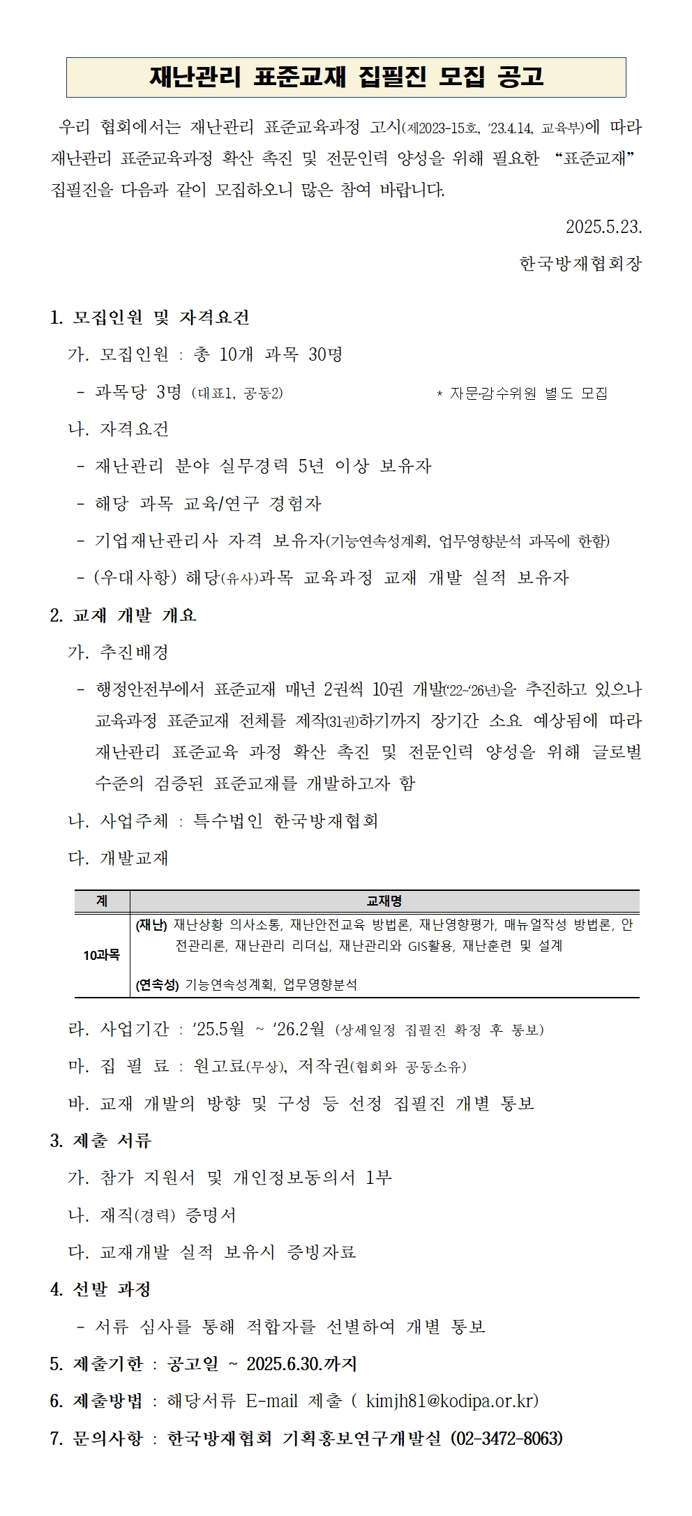 재난관리 표준교재 집필진 모집 공고 2025-05-23 [붙임] 재난관리 표준교재 집필진 지원서 양식.hwp (79360K) 목록보기 이전글한국방재협회 카카오톡 채널 친구가 되어주세요!2025.07.25 다음글재난관리 역량강화를 위한 “중대시민재해 컨설팅” 신청 안내2025.05.08