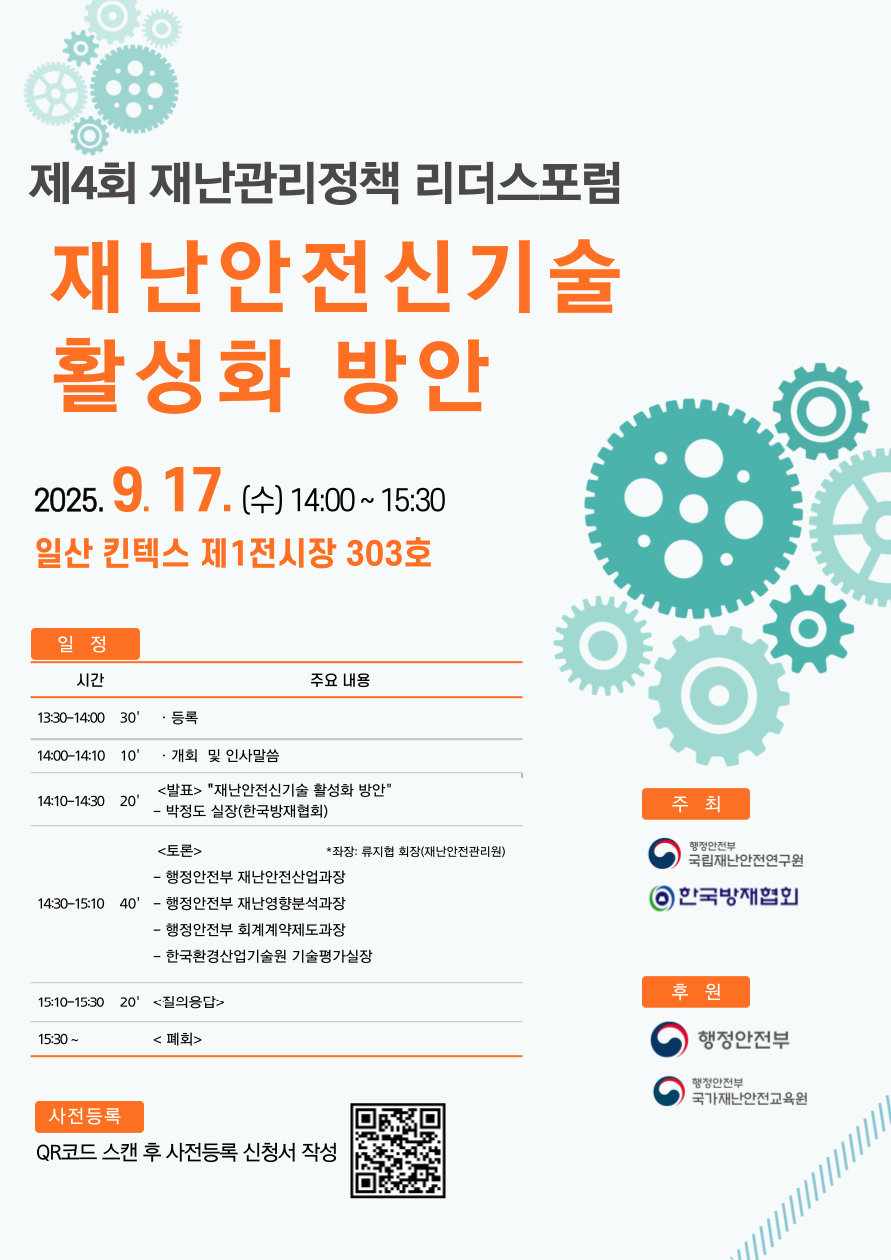 제4회 재난관리정책 리더스포럼 9월 17일 개최 2025-09-09 ▶ 사전등록 : https://forms.gle/m9R6DZdLuRXudyGU6 목록보기 이전글한국방재협회, 제4회 재난관리정책 리더스 포럼 개최2025.09.18 다음글[언론보도] 대전시, 하반기 재난 안전 종사자 전문교육 실시2025.09.03