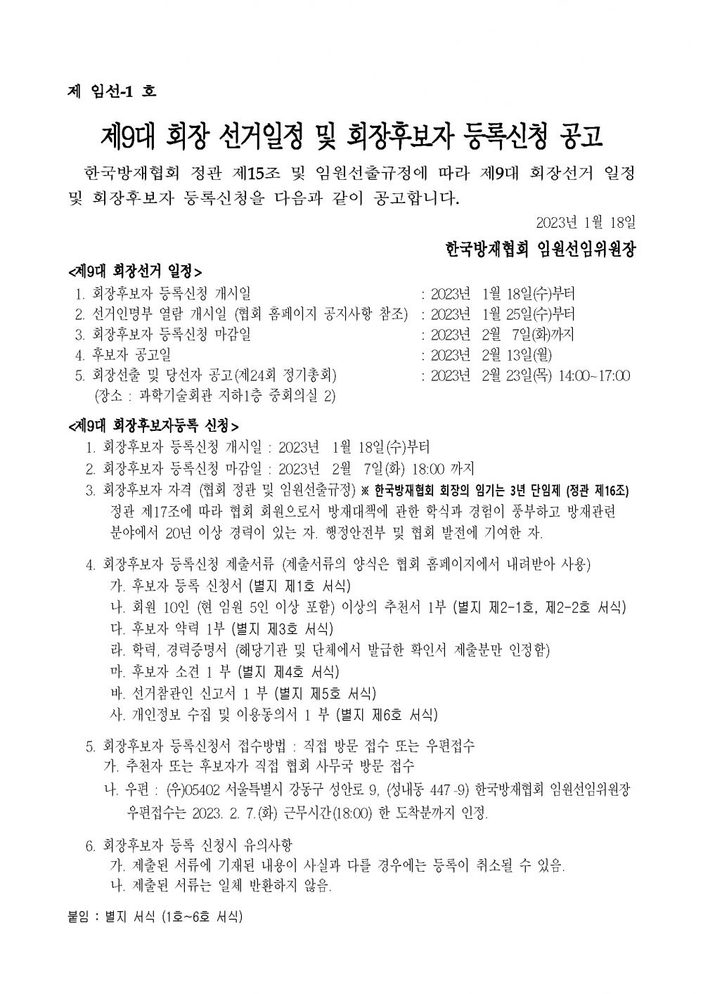 제9대 회장 선거일정 및 회장후보자 등록신청 공고 2023-01-18 (붙임) 별지서식(제1~6호).hwp (46080K) 목록보기 이전글제9대 회장 임원선임위원자격 대상자 명부 열람기간 및 장소 공고2023.01.25 다음글한국방재협회, 방재문화진흥원-전국자율방재단연합회와 업무협약 체결2022.12.29