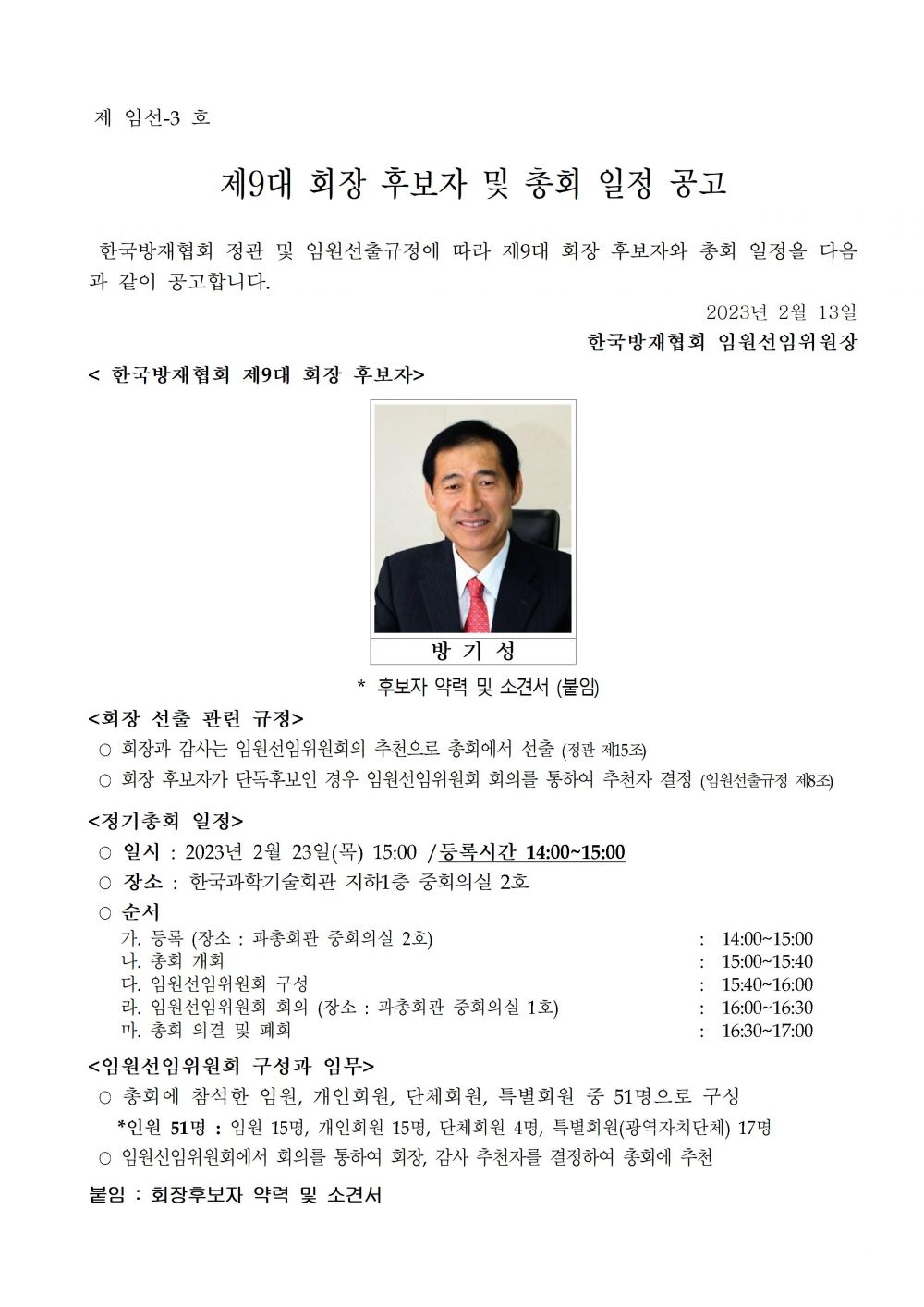 제9대 회장 후보자 및 총회 일정 공고 2023-02-13 (공고 3) 회장후보자 및 총회 일정 공고.hwp (218112K) (단체 특별) 임원선임위원 위임장.hwp (23040K) 목록보기 이전글제9대 회장 선출 공고2023.02.23 다음글홈페이지 개편 관련 소액수의 견적 제출 안내 공고2023.02.08