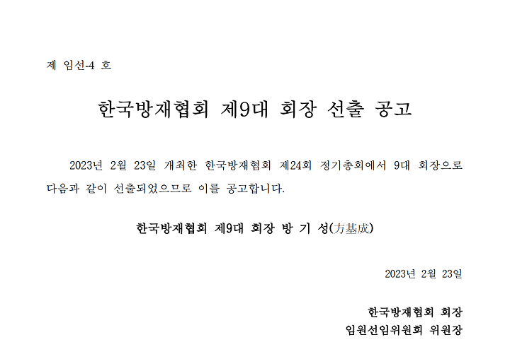 한국방재협회 제9대 방기성 회장 선출