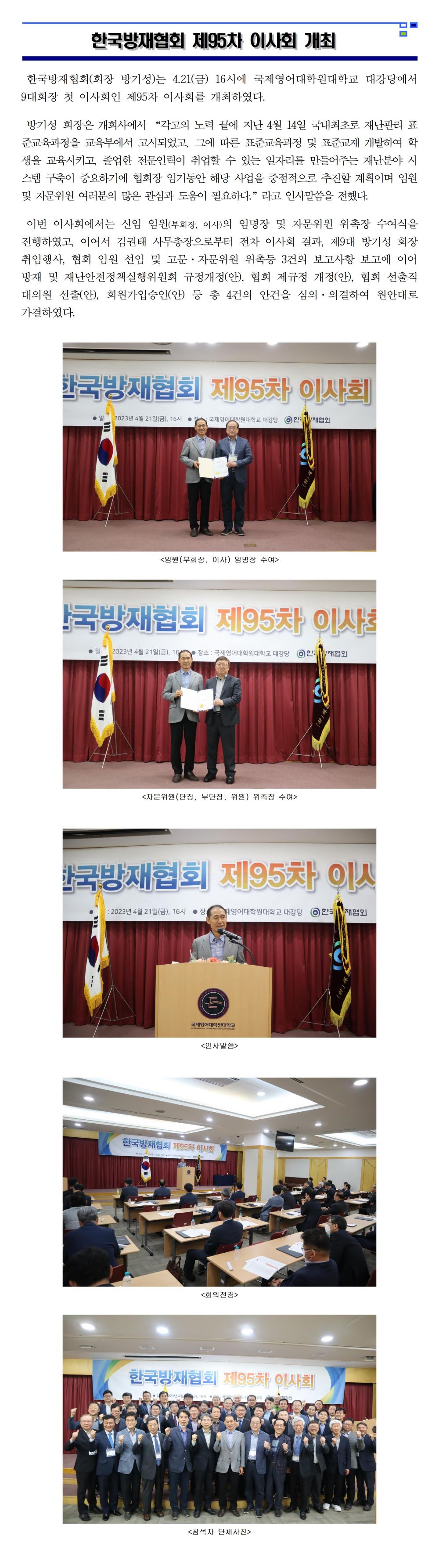 한국방재협회 제95차 이사회 개최 2023-04-24 목록보기 이전글국내 최초 재난관리 표준교육과정 고시2023.04.25 다음글한국방재협회 선출직 대의원 모집 공고2023.04.10