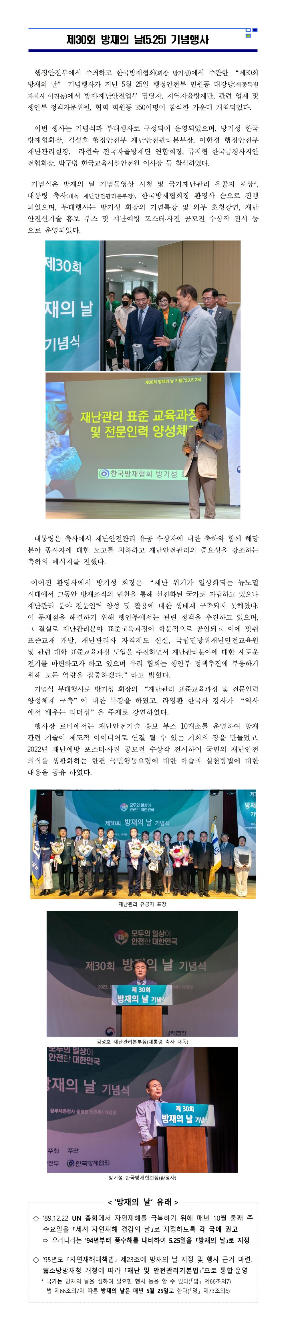 - 아주경제 : '제30회 방재의 날 기념식' 개최, 국가재난관리 유공자 포상 12점 수여 | 아주경제 (ajunews.com)