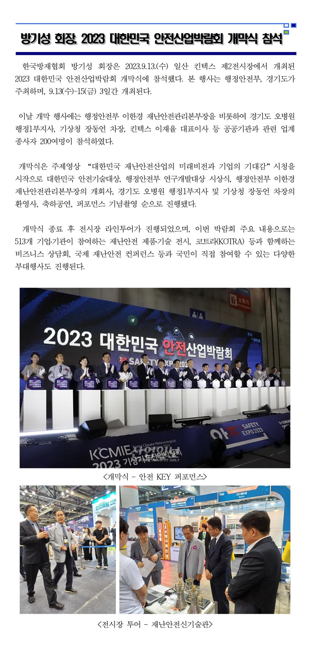 방기성 회장, 2023 대한민국 안전산업박람회 개막식 참석 2023-09-13 목록보기 이전글2023 대한민국 재난안전포럼 개최2023.09.15 다음글2023년 재난예방 포스터 공모전 안내2023.09.12