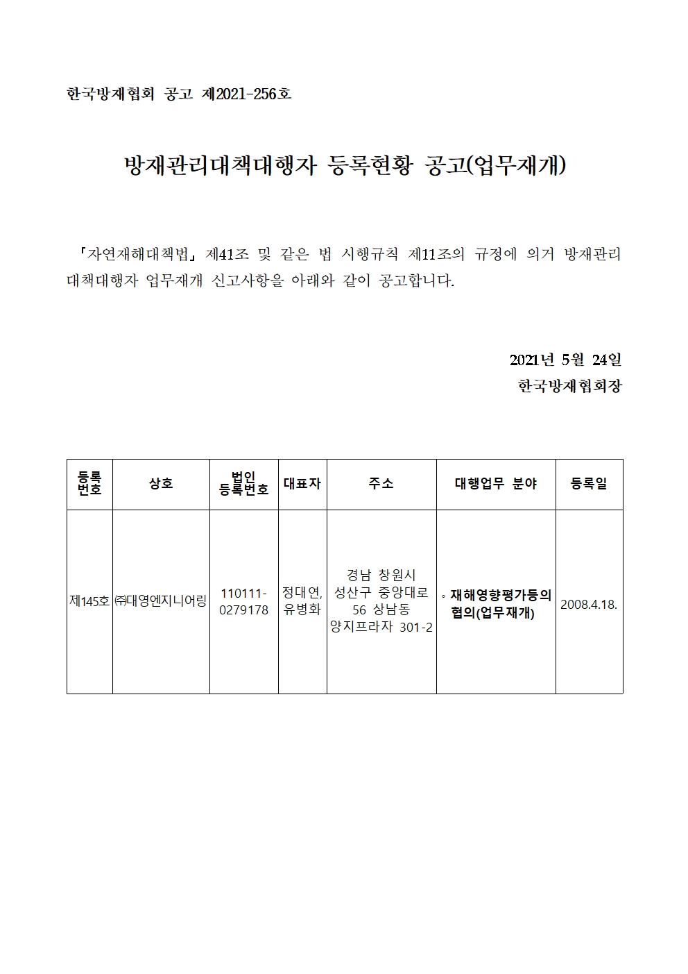 방재관리대책대행자 등록현황 공고(업무재개) - (주)대영엔지니어링 2021-05-24 공고문_제2021-256호_방재대행자 등록현황 공고(재개)_(주)대영엔지니어링.pdf (57398K) 목록보기 이전글방재관리대책대행자 등록현황 공고(변경등록) - (주)더원이앤디2021.06.14 다음글방재관리대책대행자 등록현황 공고(변경등록) - (주)동성엔지니어링2021.05.11
