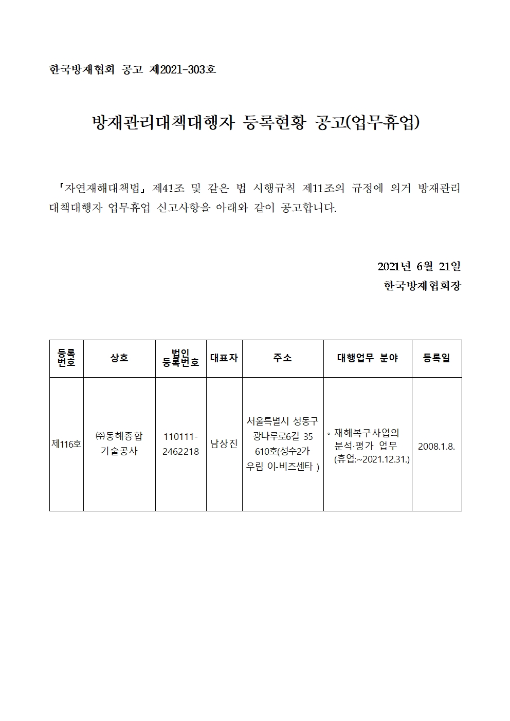 방재관리대책대행자 등록현황 공고(업무휴업) - (주)동해종합기술공사 2021-06-21 공고문_제2021-303호_방재대행자 등록현황 공고(휴업)_(주)동해종합기술공사.pdf (56971K) 목록보기 이전글방재관리대책대행자 등록현황 공고(변경등록) - (주)서현기술단2021.07.05 다음글방재관리대책대행자 등록현황 공고(변경등록) - (주)한올엔지니어링2021.05.31
