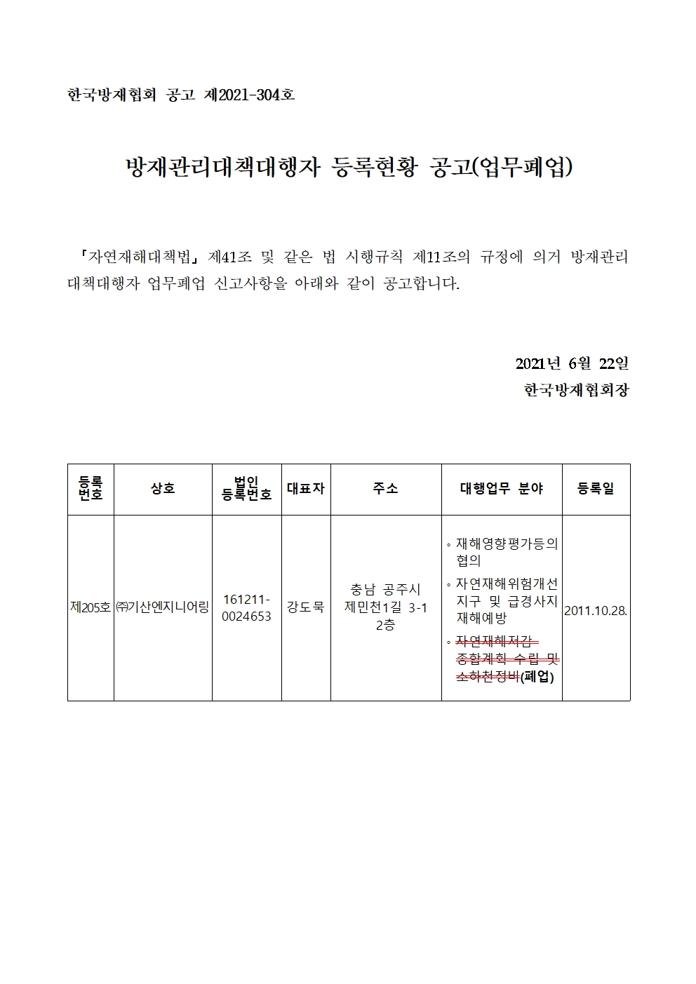 방재관리대책대행자 등록현황 공고(업무폐업) - (주)기산엔지니어링 2021-06-22 공고문_제2021-304호_방재대행자 등록현황 공고(폐업)_(주)기산엔지니어링.pdf (60024K) 목록보기 이전글방재관리대책대행자 등록현황 공고(변경등록) - (주)서광건설엔지니어링2021.07.08 다음글방재관리대책대행자 등록현황 공고(변경등록) - (주)화신엔지니어링2021.06.15