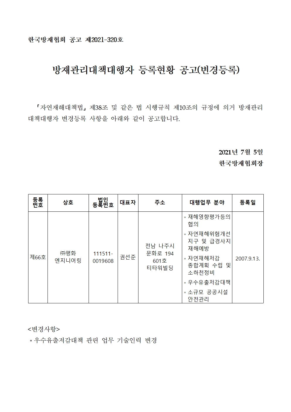 방재관리대책대행자 등록현황 공고(변경등록) - (주)평화엔지니어링 2021-07-05 공고문_제2021-320호_방재대행자 등록현황 공고(변경)_(주)평화엔지니어링.pdf (66576K) 목록보기 이전글방재관리대책대행자 등록현황 공고(변경등록) - (주)강동건설엔지니어링2021.07.15 다음글방재관리대책대행자 등록현황 공고(업무폐업) - (주)기산엔지니어링2021.06.22