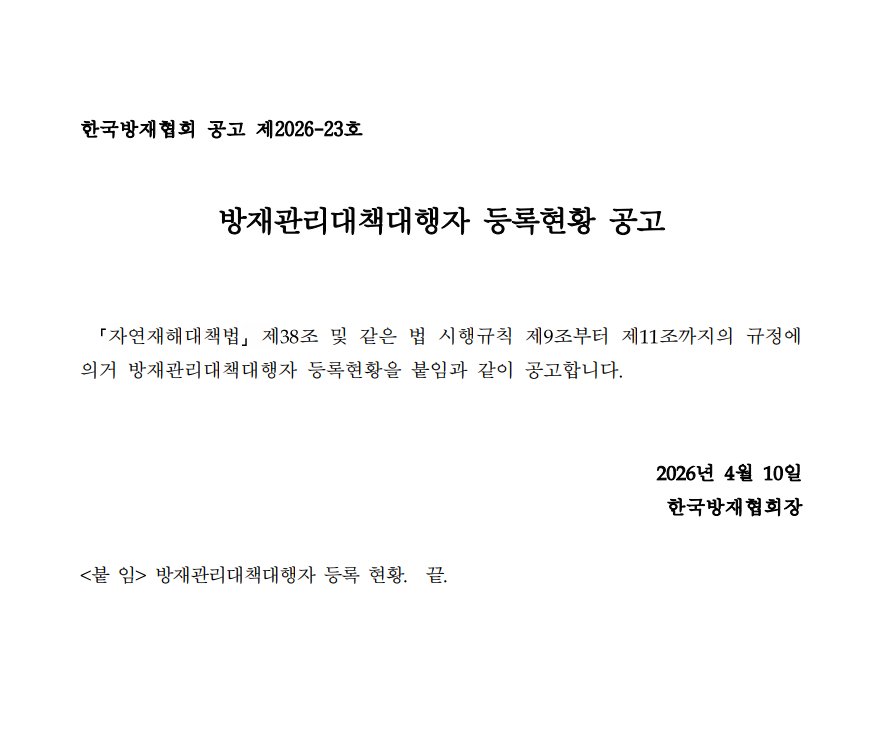 방재관리대책대행자 등록현황 공고(2026.04.) 2026-04-10 (공고문)방재관리대책대행자 등록현황 공고_25410.pdf (27K) 2. 방재관리대책대행자 등록 업체 현황(ver2)_260410.xlsx (124K) 목록보기 다음글방재관리대책대행자 등록현황 공고(2026.03.)2026.03.10