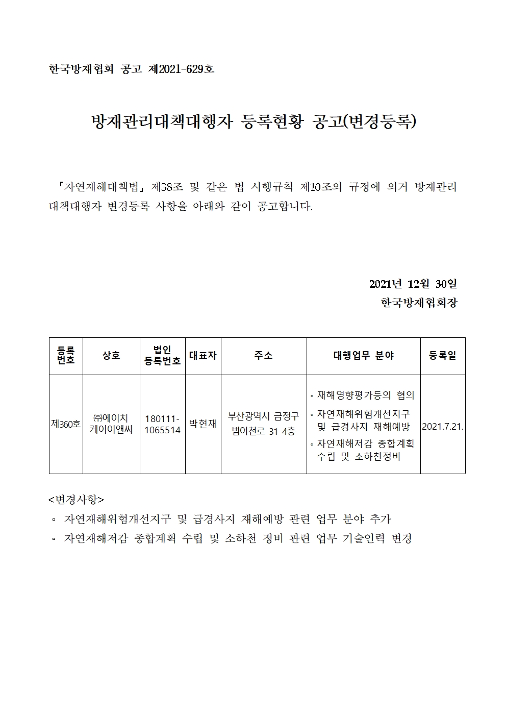방재관리대책대행자 등록현황 공고(변경등록) - (주)에이치케이이앤씨 2021-12-30 공고문_제2021_629호_방재대행자 등록현황 공고(변경)_(주)에이치케이이앤씨.pdf (66738K) 목록보기 이전글방재관리대책대행자 등록현황 공고(업무휴업) - (주)에이치케이이앤씨2021.12.30 다음글방재관리대책대행자 등록현황 공고(업무재개) - 주식회사 영진엔지니어링2021.12.30