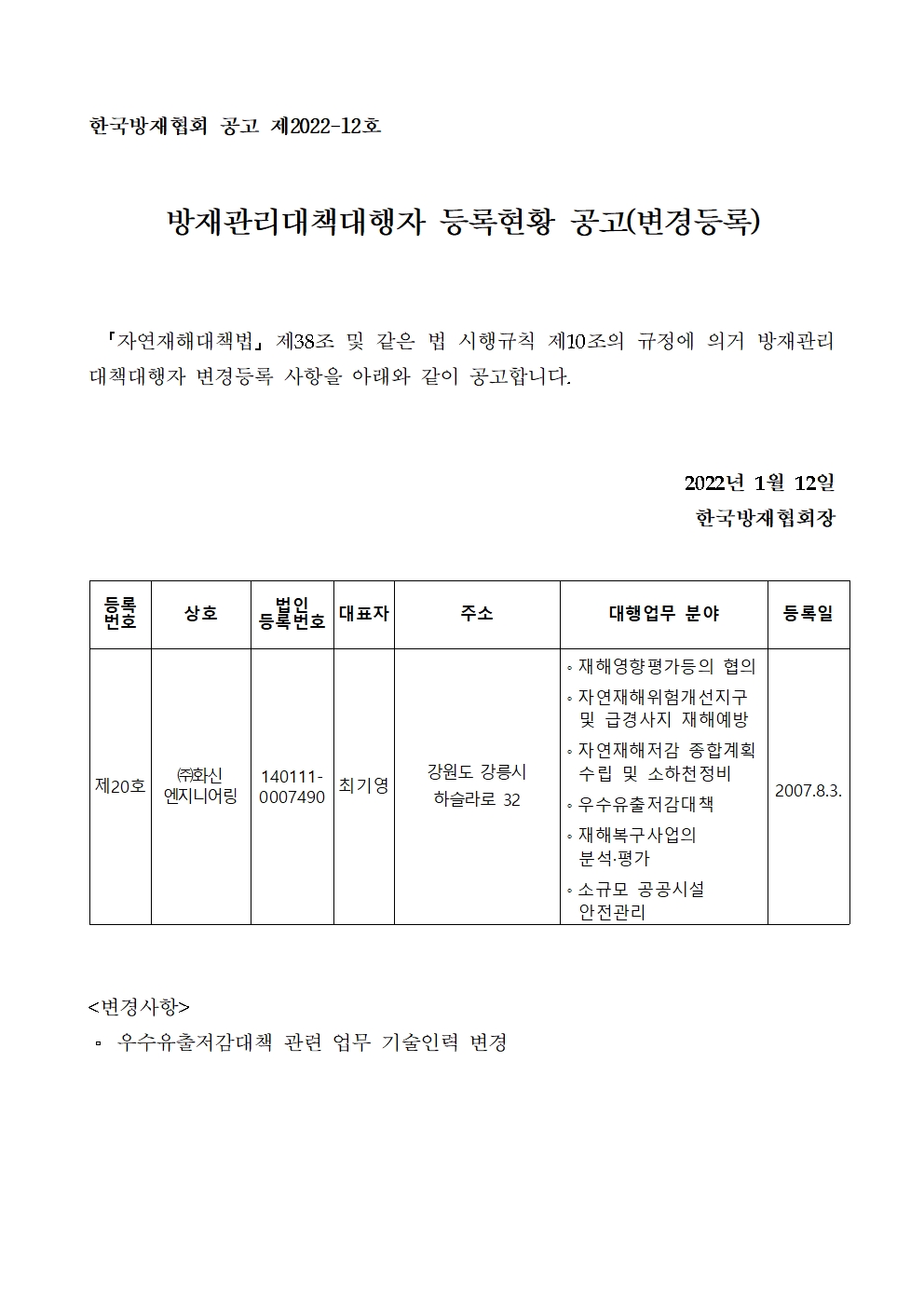 방재관리대책대행자 등록현황 공고(변경등록) - (주)화신엔지니어링 2022-01-12 공고문_제2022-12호_방재대행자 등록현황 공고(변경)_(주)화신엔지니어링.pdf (66136K) 목록보기 이전글방재관리대책대행자 등록현황 공고(업무재개) - (주)동일기술공사2022.01.12 다음글방재관리대책대행자 등록현황 공고(업무재개) - (주)우리종합기술2022.01.12