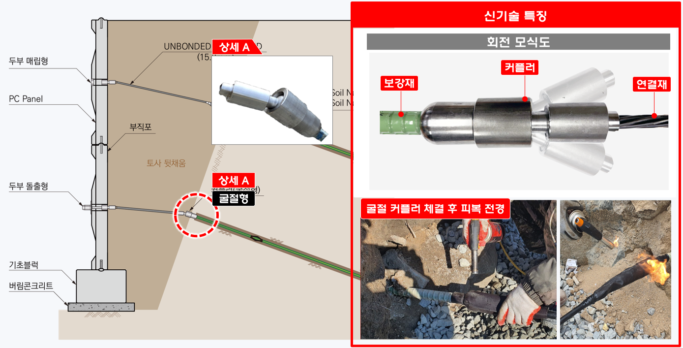 깎기비탈면에 적용하는 판넬식 옹벽 공법으로 비탈면에 설치된 철근 보강재와 전면 판넬을 연결하는데 있어, 각도 조절이 용이한 굴절형 커플러와 유연한 강연선으로 철근 보강재와 전면 판넬을 간접 연결하여 시공성을 향상시킨 기술 |