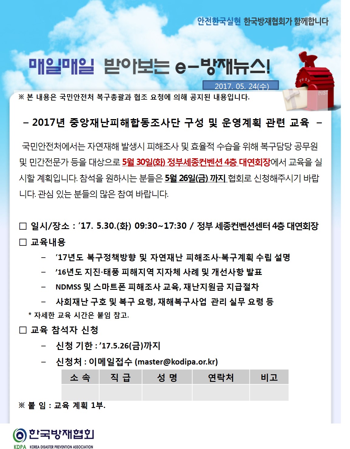 2017년 중앙재난피해합동조사단 구성 및 운영계획 관련 교육 안내 2017-05-24 [붙임]교육계획.hwp (17408K) 목록보기 이전글강원 산불 이재민에 ‘아름다운 기부’2017.05.24 다음글국민안전처, 「우이~신설 도시철도」에 통합지휘무선통신망 시스템 연동2017.05.22