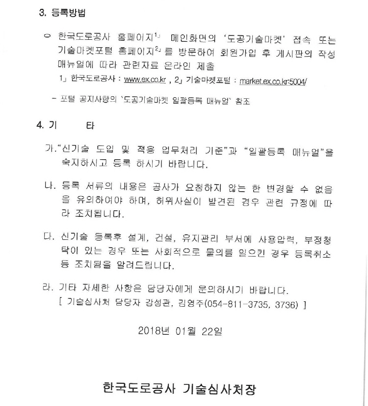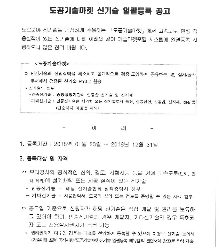 한국도로공사 '도공기술마켓' 운영 알림 2018-01-29 * 한국도로공사 협조요청에 의한 안내입니다. 문의사항 : 기술심사처 담당자 강성관, 김영주(054-811-3735,3736) 목록보기 이전글교통사고 잦은 곳 개선하니 사망자 66% 줄었네2018.01.30 다음글전기·가스 점검으로 우리집 화재 예방하세요2018.01.29